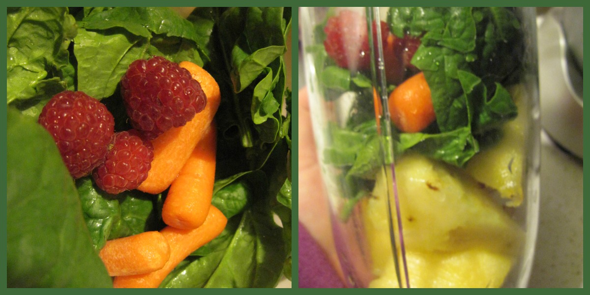 Espinacas, zanahoria, frambuesas o fresas y piña.